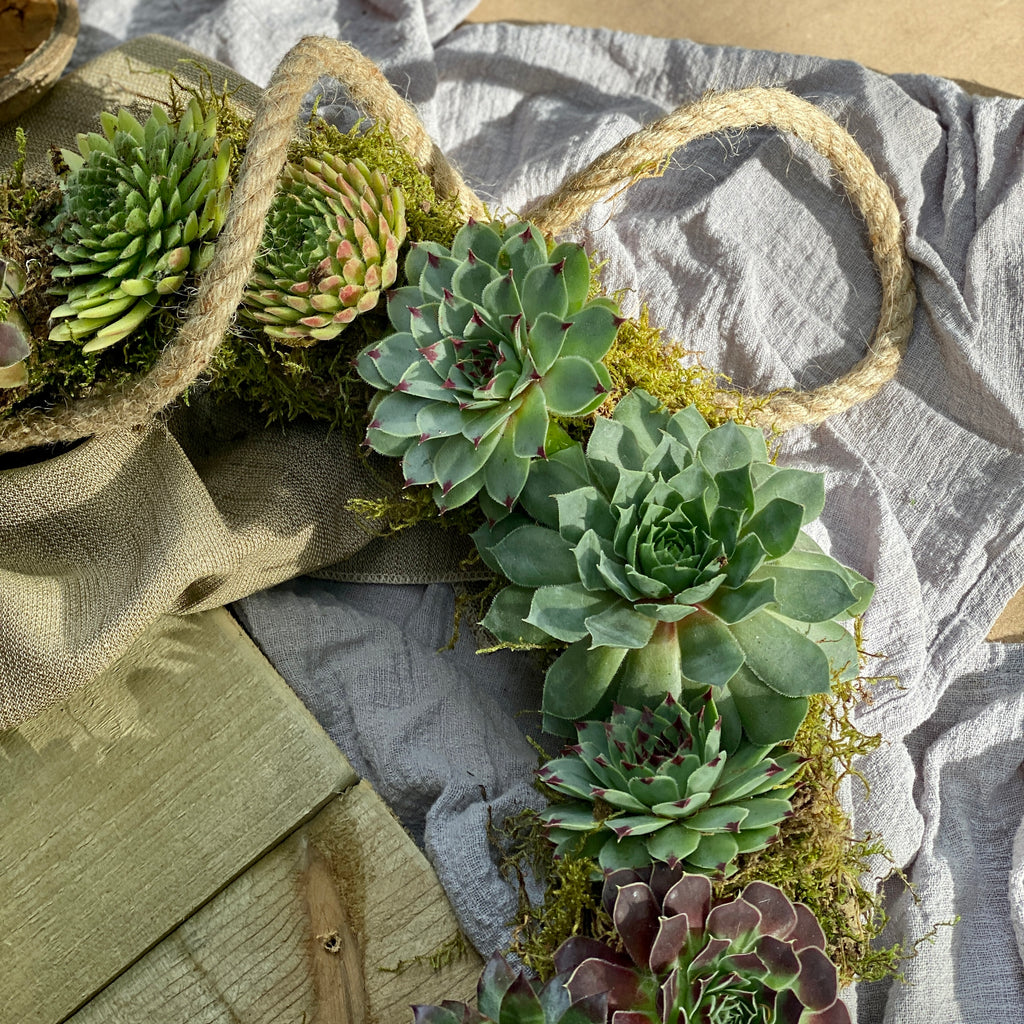 A simple garden wreath of all home grown Sempervivum succulents, created on a moss wreath base, finished with dried lichen. Jute string attached for hanging. Succulents can be planted in garden, if you would like, when changing the wreath.