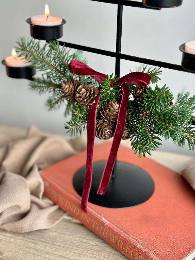 Our nightlight tree serves as a charming winter accent in your home, beautifully reflecting the season. It is adorned with freshly cut noble and Kiefer from the garden, complemented by a rich burgundy velvet ribbon.
